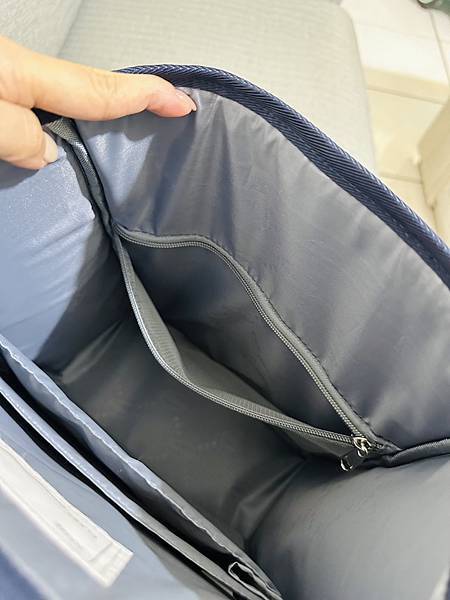 」它無法放太重或是太厚也不能太薄,它的隔層是固定寬也沒有伸縮帶,再加上它沒有底部,導致東西放了,常常底部會隨著走路晃動導致下緣的紙張都捲曲